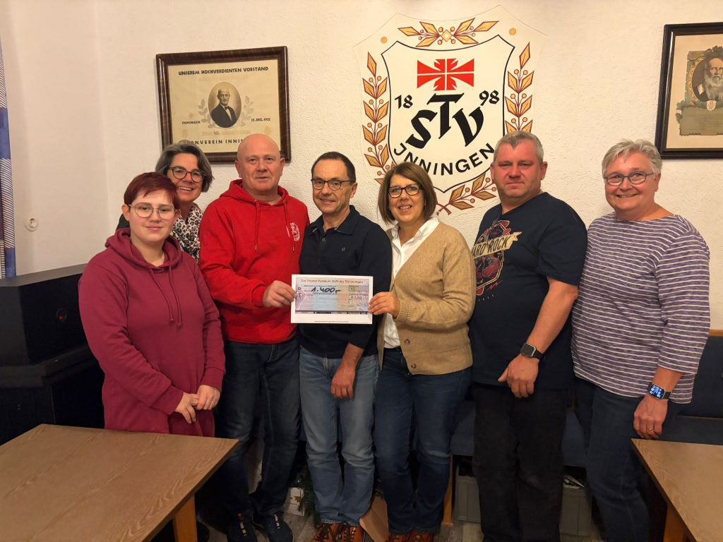 Übergabe der Publikumsspende an Glühwürmchen e.V. durch VertreterInnen der Theaterabteilung und den TSV-Vorstand, Bild v. l.nr.: Katja Genswürger, Christine Kratzer-Haugg, Jörg Weißenhorn (Vorstand des TSV Inningen), Stefan und Angelika Rehm (Vorstandmitglieder Glühwürmchen e.V.), Martin Genswürger u. Tine Ott