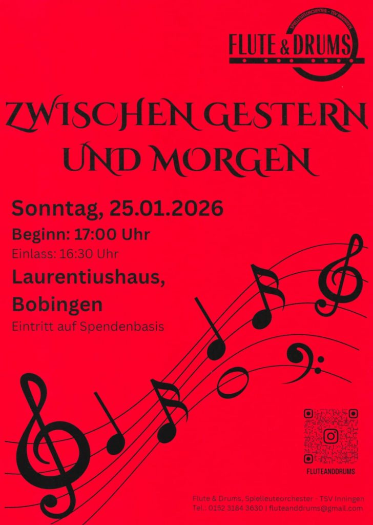 Flute & Drums lädt zum Konzert ‚Zwischen Gestern und Morgen‘ am 25.01.2026 im Laurentiushaus Bobingen ein.